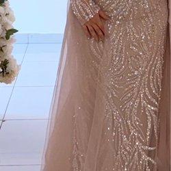 Otroligt vacker klänning med handsydda detaljer, några stenar har trillat av, men det syns knappt tack vare de silvriga detaljerna i designen. Det går även att enkelt komplettera med fler stenar om man vill. Korsett där bak så går att justera. Inköpspris: 13.000kr