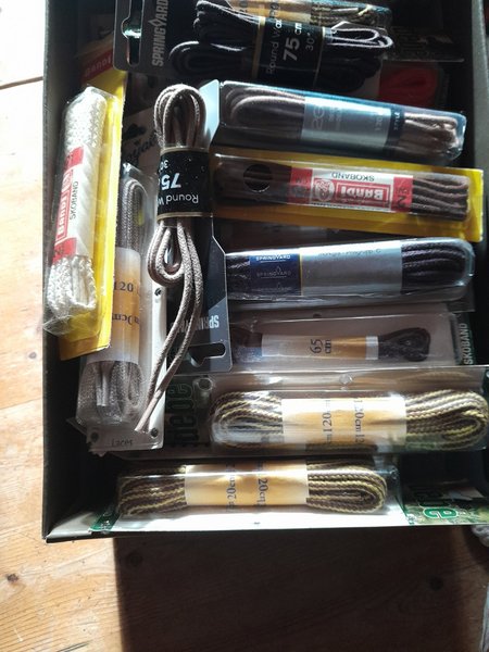En låda med 55 st skosnören i olika färger och längder från 65 till 120 cm