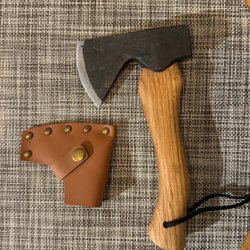 Yxa med trähandtag. Bladet är svart och märkt "MADE IN CHINA".