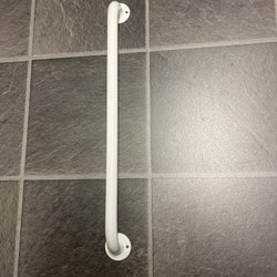 Ett handtag i metall. Avståndet mellan fästpunkterna är cirka 34 cm.