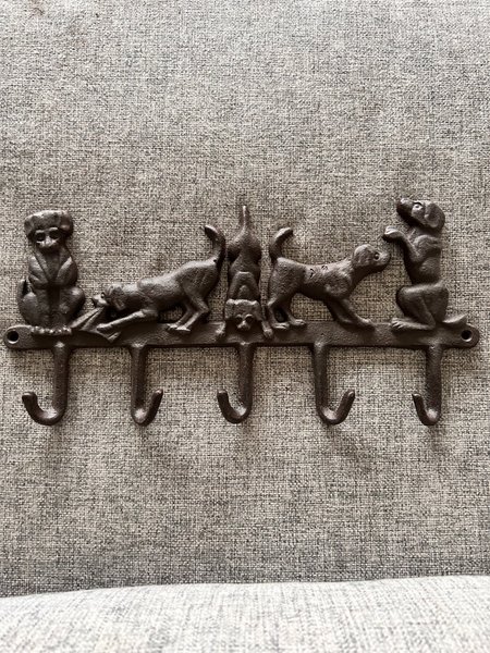 Kroklist i metall med fem krokar. Hundar i olika positioner pryder listen.