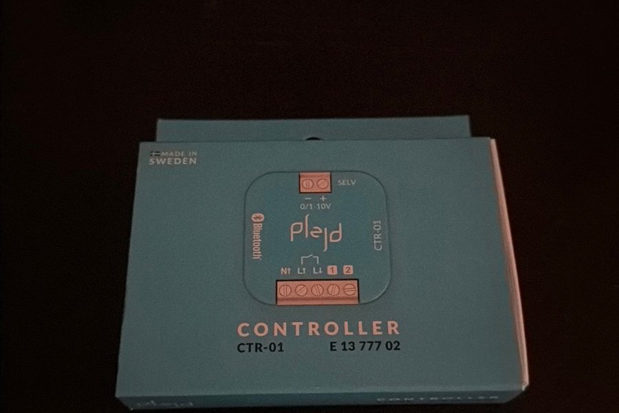 Plejd Controller CTR-01, tillverkad i Sverige. Modellen är E 13 777 02. Enheten har Bluetooth-funktionalitet och är märkt med 0/1-10V samt SELV.