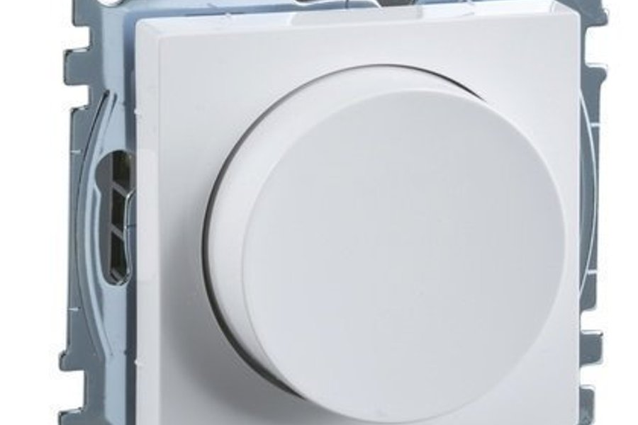 Dimmer för infällt montage. Denna dimmer är avsedd för att justera ljusstyrkan på belysning. Den har en vit ratt för enkel användning och är designad för att monteras infällt i väggen.