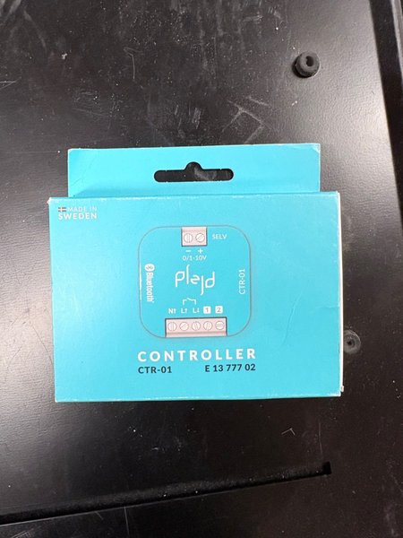 Plejd Controller CTR-01, tillverkad i Sverige. Denna enhet är en del av Plejds sortiment för smart belysningsstyrning. Den har Bluetooth-anslutning och är märkt med E 13 777 02.