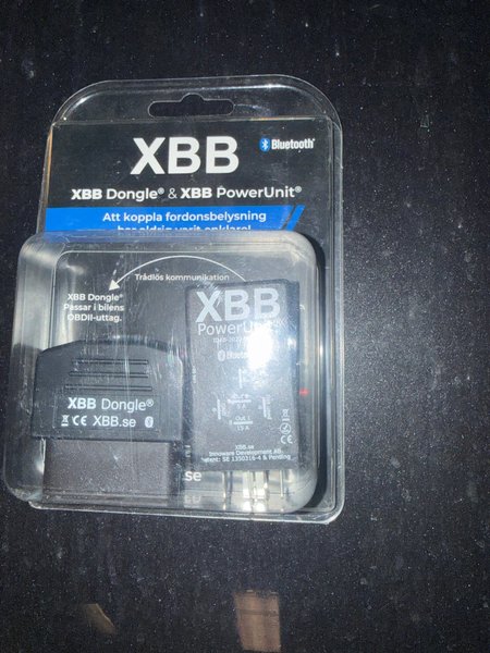 XBB Dongle och PowerUnit för att koppla fordonsbelysning. Trådlös kommunikation via blåtand. XBB Dongle passar i bilens OBDII-uttag.