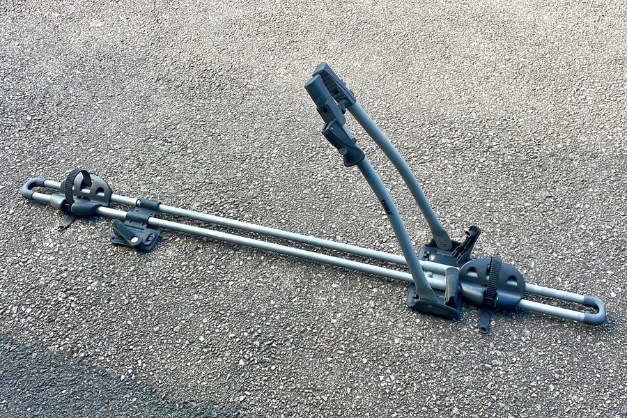 Cykelhållare från Thule FreeRide 532, designad för takmontering. Den har en robust konstruktion för säker transport av cyklar. Hållaren är utrustad med fästremmar för att säkra cykelhjulen och en ramhållare som håller cykeln på plats.