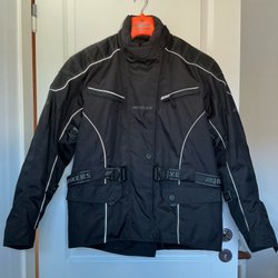 Jacka dam i storlek 38. Har inbyggda skydd. Nära nyskick. Har använts vid Mc-åkning.