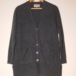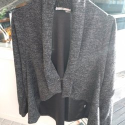 En mörkgrå kofta med långa ärmar och knäppning framtill. Den har en rund halsringning och ribbstickade muddar. Tyvärr har lapparna ramlat av, men den är i storlek Medium.