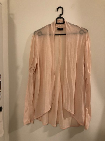 Ljusrosa kofta med långa ärmar. Den har en öppen design framtill och en avslappnad passform.