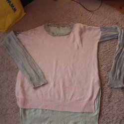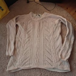 Ljusgrå, långärmad kofta med knappar framtill och ribbstickad kant nedtill och vid ärmslut.