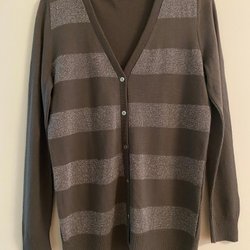 Tröjan har ett fint bladmönster, två fickor framtill, och extra knappar sydda inuti om någon skulle tappas bort.