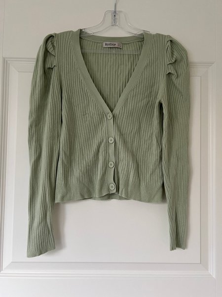 Grön, ribbstickad kofta med puffärmar och V-ringning. Den har knappar framtill.