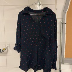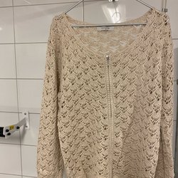 Grå kofta med svarta prickar och knappar framtill. Koftan har långa ärmar och en rundad halsringning.