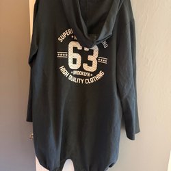 Svart kofta med en assymetrisk design. Koftan har en öppen front och långa ärmar. Observera att det finns två små hål på koftans baksida, som visas på bilden.
