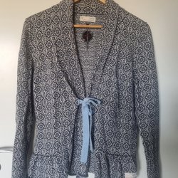 Mörkblå stickad kofta med krage, knäppning framtill och broderad detalj baktill. Koftan har även två fickor fram.storlek: 1