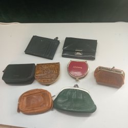 Ett parti med plånböcker i olika utföranden. Vissa har plats för kontokort och sedlar, andra har en sedelklämma. Några av plånböckerna har texten ”Malmö Arena” tryckt på framsidan.20.st.