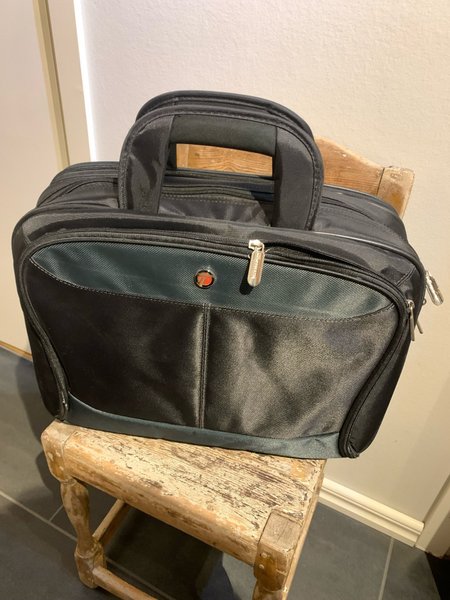 Svart väska med handtag och flera fack. Väskan har en silverfärgad dragkedja och en liten logotyp på framsidan.
