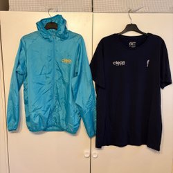 Säljer ett paket med två tröjor från Grand Frank. Den ena tröjan är svart med en val på framsidan, och den andra är mörkblå med ett tryck av flamingos, hibiskusblommor och blad.