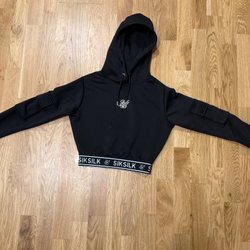 Svart kortärmad tunnare hoodie med dragkedja framtill och en broderad detalj på bröstet. Hoodien har fickor fram och en vit rand på ärmen. Något blekt, i övrigt fint skick. Storlek framgår ej, men rimligtvis M/L. Kort modell.