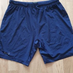 Ett par svarta shorts med fickor på sidorna av benen.