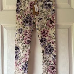 Vit blommig hängslebyxa/långbyxa med justerbara axelband och fickor.