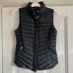 Svart, lång väst från Gant med dragkedja och tryckknappar framtill. Västen har en hög krage och två fickor fram.