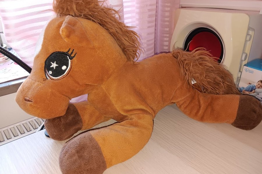 Mjukishäst i brunt tyg med mörkbrun man och svans. Hästen har broderade ögon med en stjärna i ena ögat.