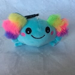 Två gosedjur. Ett blått fluffigt gosedjur med vita detaljer och ett rosa/lila fågel gosedjur.