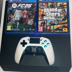 Playstation 4 Pro med tillbehör. Inkluderar en handkontroll och ett headset.