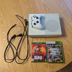 Säljer en Xbox One S konsol. Konsolen är vit och har en svart bas. Strömkabel medföljer.
