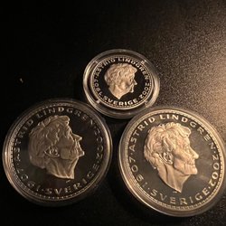 Fem svenska mynt. Ett mynt från 1955 med ett värde av 5 KR. Ett mynt från 1945 med ett värde av 2 KR. Ett mynt från 1958 med ett värde av 2 KR. Ett mynt från 1957 med ett värde av 1 KR. Ett mynt från 1906 med ett värde av 1 KRONA.