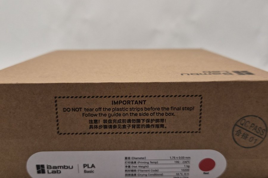 Bambu Lab PLA Basic filament i röd färg. Diametern är 1.75 ± 0.03 mm. Rekommenderad utskriftstemperatur är 190-230°C. Nettovikten är 1 kg. Filamentkoden är 10200. Torkningsförhållanden är 55°C i 8 timmar.