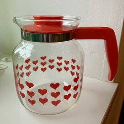 En glaskanna med handtag och pip. som är hel o fin. men behöver diskas
