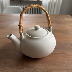 En tekanna i färgerna mörk brun och en lite ljusare brun färg, finns lock till den och den är hel. Ungefär höjd 13cm lång 23 cm