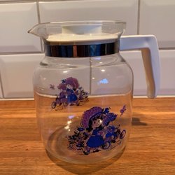 En glaskanna med ett handtag och en pip. Kannan har ett mönster av vertikala linjer och ett texturerat mönster runt basen.
