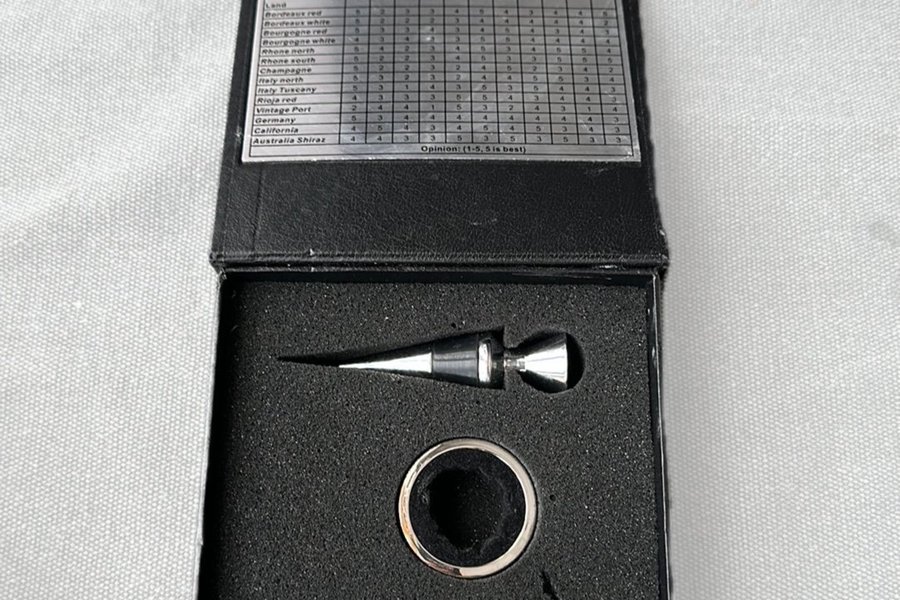 Set med vintillbehör. Inkluderar vinöppnare, vinkork och droppring samt tillhörande låda.