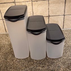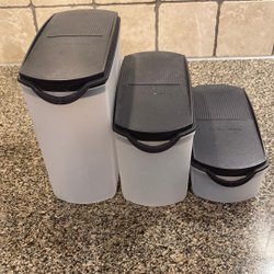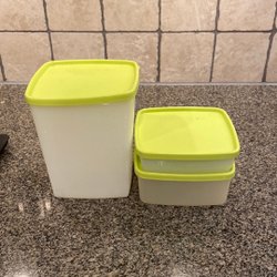 Set med Tupperware behållare med lock. Fryslådor. En stor behållare och två mindre behållare.