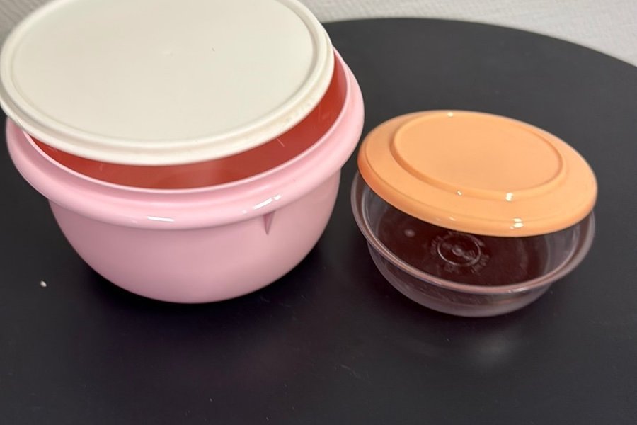 Set med plastskålar i olika färger. En rosa skål med vitt lock och en mindre transparent skål med orange lock.