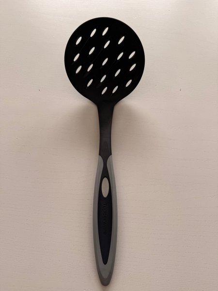 Svart hålslev från Tupperware med grått handtag. Sleven har hål för att enkelt sila vätska.
