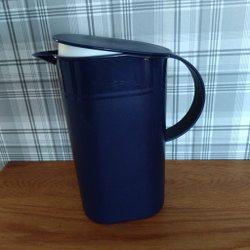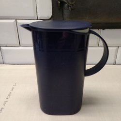 Vit, benvit kanna från Tupperware med lock. Bra att hälla ur och med isbitar i gör att isbitarna stannar kvar innanför den lilla pipen.