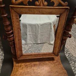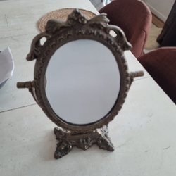 En bordspegel med en kromad ram och ett ställ. Perfekt för sminkning eller rakning.