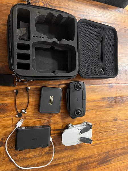 DJI Mini 2 Fly More Combo med drönare, handkontroll, batteriladdningshubb, tre batterier, propellerhållare, axelväska och diverse kablar.