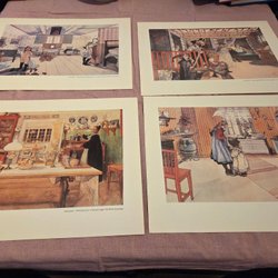 Fyra tryck av Carl Larsson. Motiven inkluderar "Ateljén", "Köket", "Läshörnan" och "Huset". Trycken är i färg.