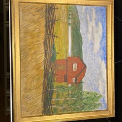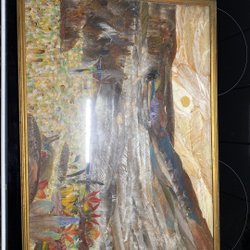 Tavla med motiv av träd och löv i varma färger. Signerad H. Gillberg.gjort på olika fjädrar