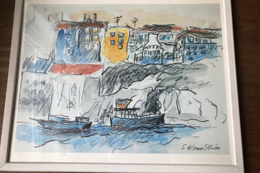 En tavla med motiv. Hamn med bostadshus se foto