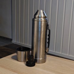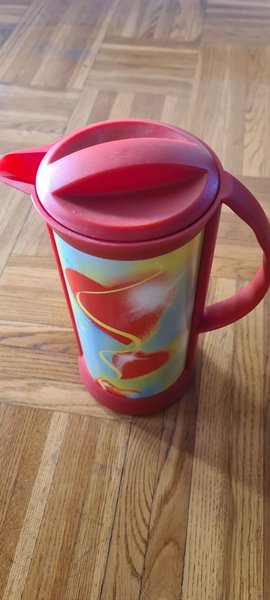 En röd termos med lock och handtag. Hjärtmotiv. 26 cm hög. Fint ytskikt, repor invändigt i botten.
