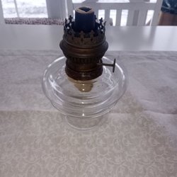 En vacker gammal fotogenlampa med en detaljerad fot i metall och en glasbehållare. Den har en klassisk design med en hög skorsten i glas. Perfekt som en dekorativ inredningsdetalj.från 40 tal 40cm h