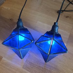 Två fina gamla fönsterlampor med glaskupor som har mönster och vågade kanter. Lamporna har en guldfärgad sladd (som samlas) och en stickkontakt. Sladdarna är olika längden. Det första bild visar skillnaden. Ca. 16 cm höga och 15,5 cm breda. Utan skador.