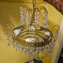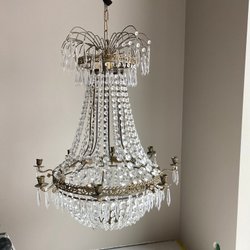 - Stil: Inspirerad av franska/italienska rokokokronor (svängda armar, droppformade prismor).