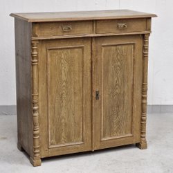 Skåp i trä med dekorativa detaljer. Skåpet har två dörrar med nyckelhål och står på fyra ben.